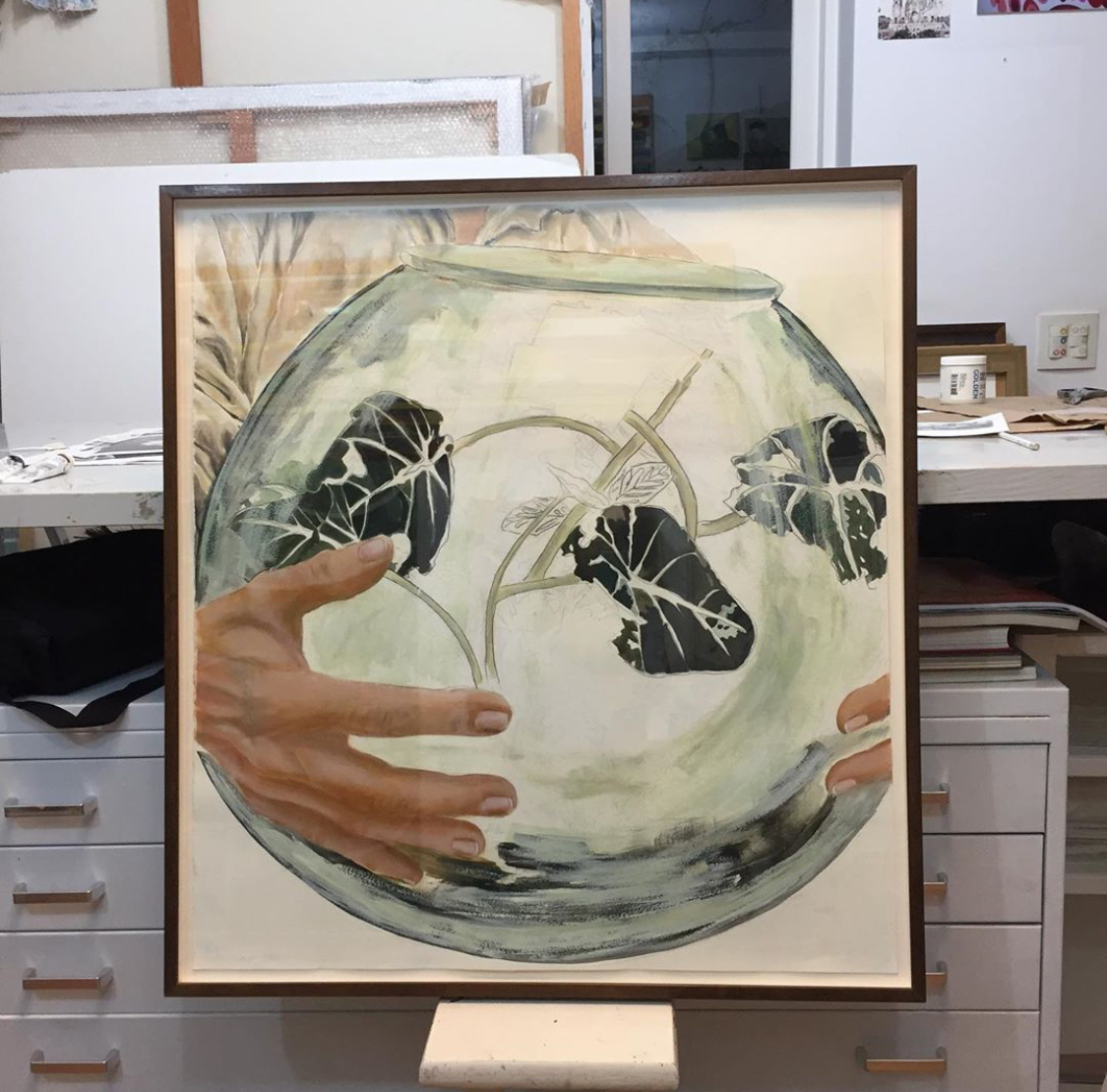 helen faganello, auto retrato com alocasia negra 3, óleo e grafite sobre papel, 75 x 73 cm, 2018.